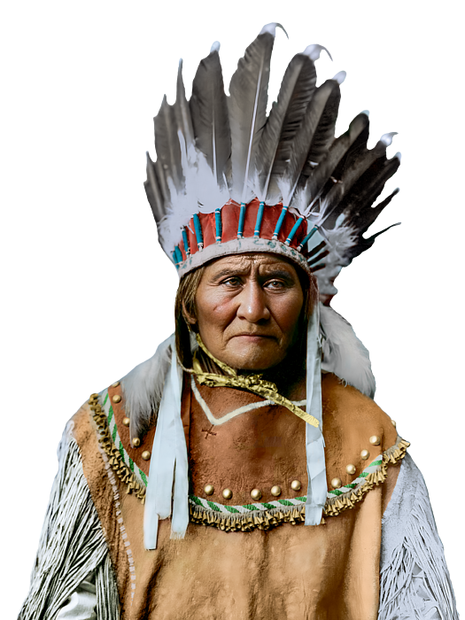 This portrait is a stunning restoration of a historical photograph taken in 1886 by C.S. Fly, depicting Geronimo, one of the most legendary and influential Native American leaders of all time. Geronimo was born in 1829 into the Bedonkohe band of the Apache tribe in present-day Arizona. He became a renowned warrior and medicine man who led his people in resisting the encroachment of Mexican and American settlers on their lands for decades. He was known for his courage, cunning, and spiritual power, as well as his skill in guerrilla warfare. He surrendered to the US Army in 1886 after a long and bloody campaign and spent the rest of his life as a prisoner of war. He died in 1909 at Fort Sill, Oklahoma.